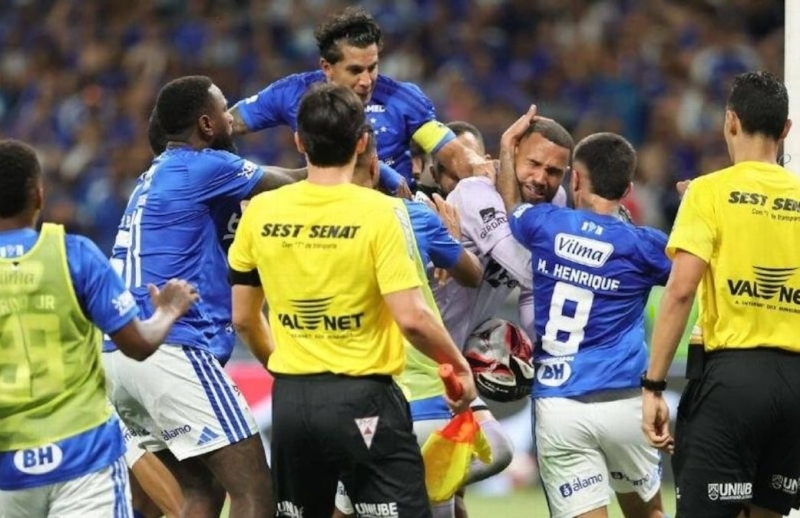 El árbitro fue el siguiente en llegar, pero prácticamente lo hizo solo para ser testigo de lo que estaba a punto de suceder; jugadores de los dos equipos, en su mayoría de Cruzeiro, llegaron para enfrentarse unos con otros, pero con el paso de los segundos se fueron sumando más y más, todo dentro de la portería del Atlético Mineiro, luego vinieron elementos de las bancas, ya incluso con algunos miembros de los cuerpos técnicos haciendo lo posible por separar.